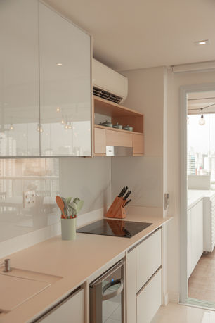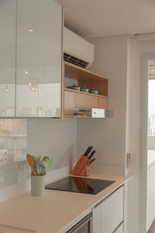- A serralheria branca com prateleiras de vidro traz leveza;