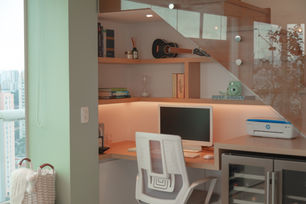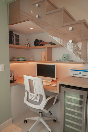 - O home office embaixo da escada proporciona uma otimização do espaço;
