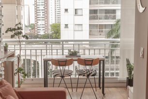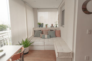 - Na varanda produzimos um ambiente ideal para ela receber os amigos, com futton e mesa de apoio móvel para apoiar bebidas e comidas.