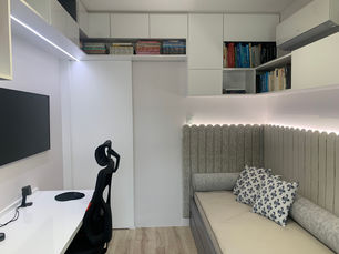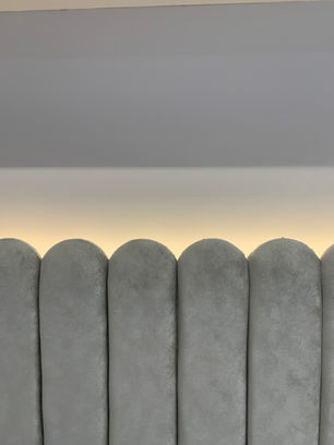 - A cabeceira foi feita de tecido para trazer conforto ao espaço e finalizamos com fita de led para permitir uma iluminação mais amena quando necessário.