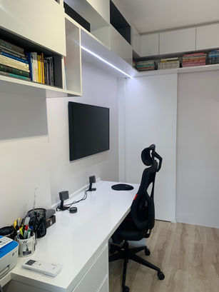 Os clientes nos pediram para que em um único cômodo coubesse: uma bancada para escritório com espaço para jogar games, área para realizar exercícios em um equipamento elíptico, contemplar uma cama com bicama para receber hóspedes e espaço para armazenamento dos livros.